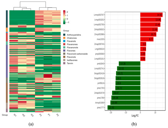 Using the criteria of a Fold Change of ≥2 or ≤0.5, along with variable importance in projection of ≥1, the 118 differentially accumulated metabolites (DAMs) were classified into 10 categories, including Flavones (38), Tannin (4), Flavanonols (4), Flavanones (10), Chalcones (5), Flavonols (23), Anthocyanidins (20), flavonoid carbonoside (6), Flavones (1), and Isoflavones (7); in P and W petals, 63 metabolites content showed an increase, while 55 showed a decrease (Table S2, Figure 2a). As shown in Figure 2b, the highly significantly regulated DAMs were anthocyanidin compounds (pme1777, Amxp01686, pme1786, Zmbp002578, pme1793, pmf0616, Smpp002618, and Smpp002418), Flavonol compounds (Lmmp003767), and flavonoid carbonoside compounds (Lmnp002741).