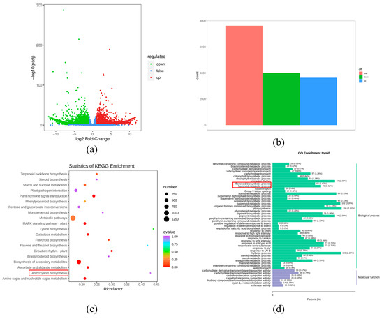 Figure 3. (a) Volcano figure of DEGs between P vs. W; (b) the number of the DEGs between P vs. W; (c) KEGG-enriched pathway analysis; (d) fifty GO enrichment pathway between white and purple flowers in V. stricta.