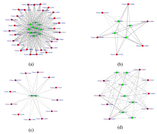 Figure 5. Association analysis between metabolome and transcriptome: (a) Ko00941; (b) Ko00942; (c) Ko00943; (d) Ko00944; flavonoid biosynthesis (ko00941), anthocyanin biosynthesis (ko00942), Isoflavonoid biosynthesis (ko00943), flavone and flavonol biosynthesis (ko00944); green: metabolite; red: gene; solid lines: positive correlation; dashed lines: negative correlation.