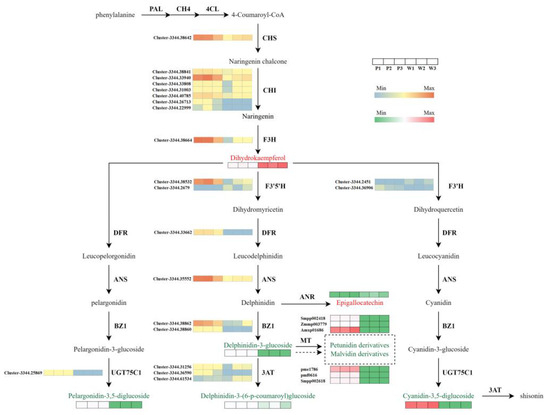 Figure 6. Biosynthetic pathway of anthocyanin in purple petals of P and white petals of W. Gene expression in the heatmaps was scaled using FPKM values; metabolite heatmaps were constructed based on the relative content of metabolites; red metabolites indicate upregulation, while green metabolites indicate downregulation.
