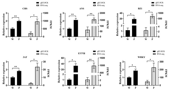 Figure 7. Verification of genes related to anthocyanin biosynthesis by qRT-PCR analysis. Asterisks denote t-test significance: * p < 0.05; ** p < 0.01.