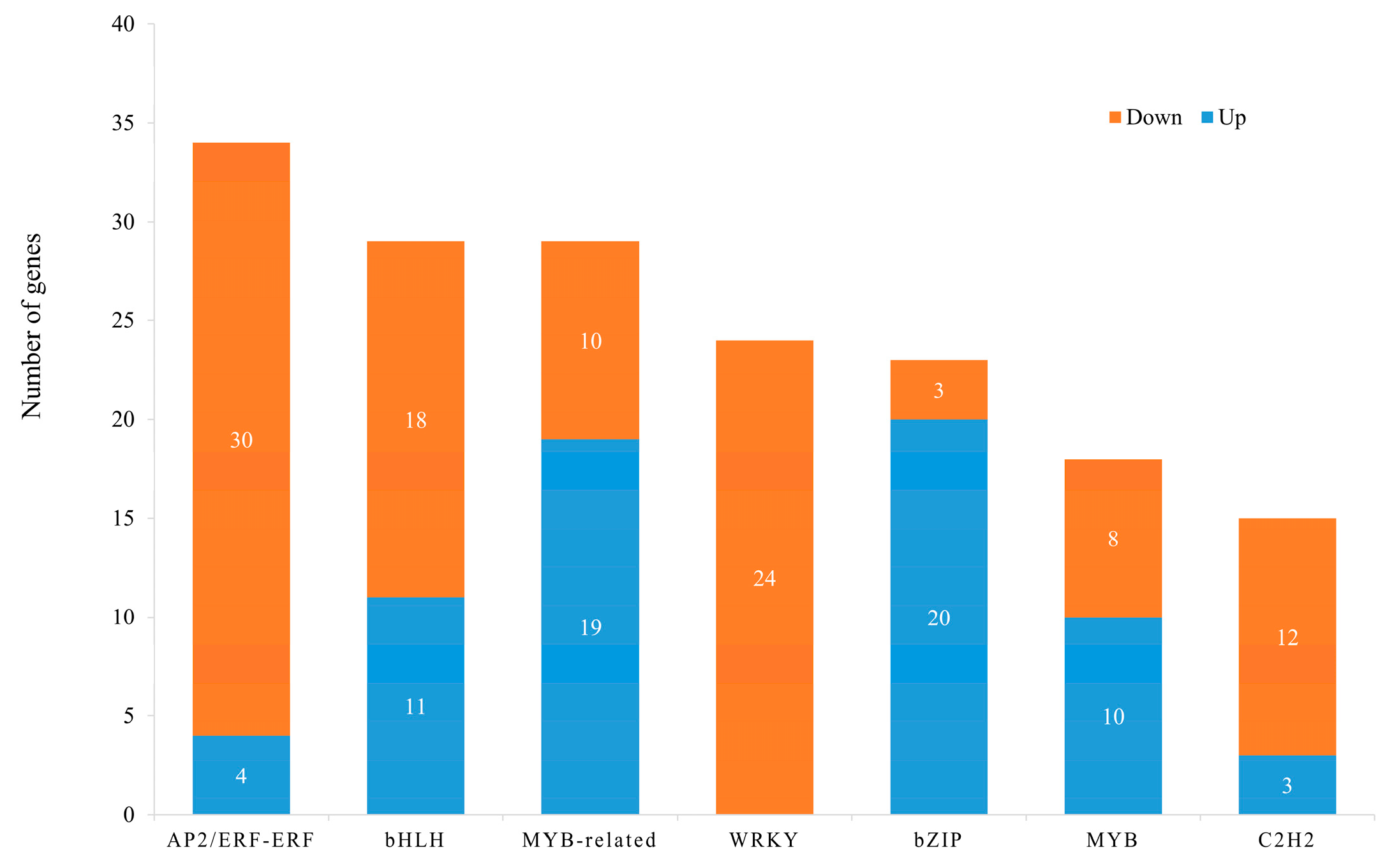 In total, 493 differential transcription factors were identified between white and purple petals, of which 289 were downregulated and 204 were upregulated. ERF (34), MYB (18), MYB-related (29), bZIP (23), BHLH (29), and C2H2 (15), which were related to anthocyanin biosynthesis, were found in this study (Figure 4). It is noteworthy that all 24 WRKY TFs were downregulated. The upregulated genes in the bZIP family were only three, and the downregulated genes of the ERF family had four. These TFs probably have crucial roles in regulating the anthocyanin biosynthetic processes involved in color change in V. stricta.