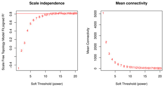 Soft-threshold power selection for gene co-expression network construction. Left panel: red line represents scale-free topology fit index across varying soft-threshold powers. Right panel: mean connectivity changes with increasing soft-threshold power.