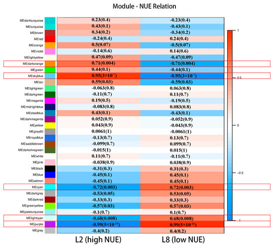 Modules such as darkorange and skyblue, which show positive correlations, were considered to be active in the high NUE line, whereas modules like purple, cyan, and lightcyan, showing negative correlations, were considered to be active in the low NUE line, all of which were targeted for further comprehensive functional studies.