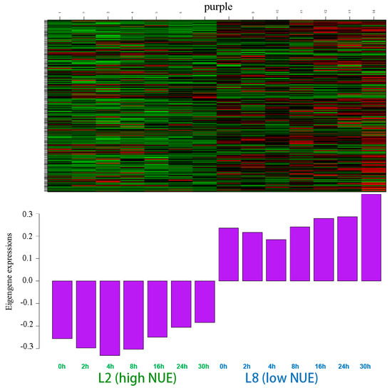 The purple module, encompassing 241 genes, displayed distinct expression patterns across the seven different time points in response to high nitrogen. Figure 3 illustrates that eigengene expressions differ significantly between the high NUE and low NUE cucumber lines. A peak in expression at 4 h in the high NUE line corresponded to the lowest expression in the low NUE line, highlighting significant differences in high nitrogen response.