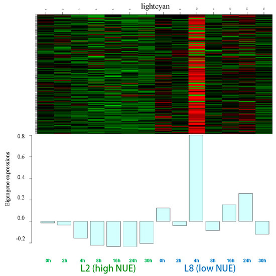 The cyan module comprised 200 genes. Marked differences in eigengene expressions between the high NUE and low NUE lines were particularly prominent at 4 h, where the low NUE line showed a peak in positive values, which is in stark contrast to the negative values observed in the high NUE line (Figure 6).