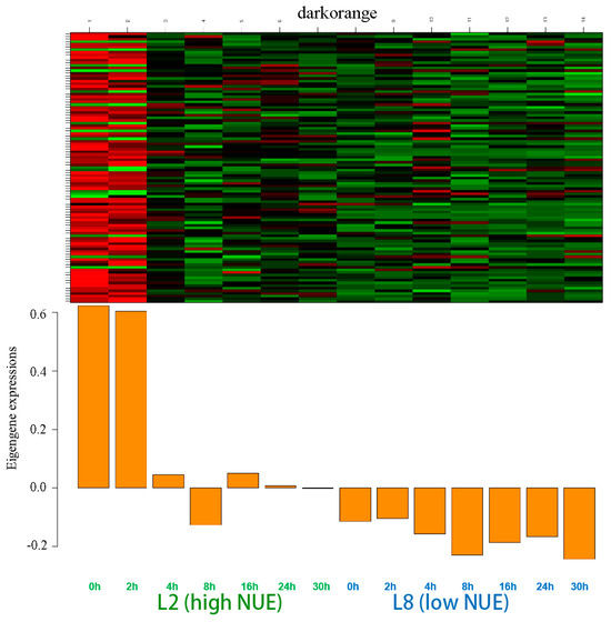 The darkorange module encompassed 101 genes. Notably higher eigengene expressions were observed at 0 and 2 h in the high NUE line, marking these periods as critical for gene activity within this module. In contrast, the low NUE line exhibited negative values at these times (Figure 5).