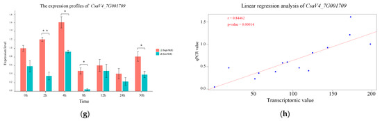 As illustrated in Figure 8c, CsaV4_1G002492 showed no differences in expression before high nitrogen treatment. A significant down-regulation in the high NUE line was observed at all time points except at 8 h, and a significant up-regulation in the low NUE line was observed at all time points. Figure 8e revealed that CsaV4_2G003460 exhibited a higher expression in the low NUE line at 0, 2, 8, and 30 h than that in high NUE line. According to Figure 8g, CsaV4_7G001709 showed up-regulation at 2 h and 4 h, but down-regulation at other time points in the high NUE line, while in low NUE line, it was up-regulated at 4 h, but down-regulation at other time points.