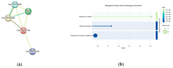 Four interacting proteins were identified through protein interaction predictions for CsaV4_3G000307 (Csa_3G027720) (Figure 9a). Notably, NIR and the protein of Csa_2G372190 were recognized within the nitrogen metabolism pathway, as indicated in the KEGG database (Figure 9b). The protein of Csa_3G730930 was linked to the ammonium transmembrane transporter complex. The protein of Csa_2G372190 was characterized as a non-specific serine/threonine protein kinase within the protein kinase superfamily. The protein of Csa_3G150160 was characterized as glutamine synthetase, which plays a crucial role in nitrogen assimilation.