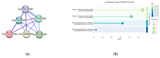 Five interacting proteins were identified through protein interaction predictions for CsaV4_1G002492 (Csa_1G418780) (Figure 10a). Csa_3G644800 contained the Cupin 1 domain. The proteins of Csa_2G296030 and Csa_7G447890 are characterized as having undefined functions. The protein of Csa_6G118360 possessed a C2H2-type zinc finger domain, which is typically involved in the transcriptional regulation of plants. The protein of Csa_7G453500 contained a plastocyanin-like domain, which is related to photosynthesis. Figure 10b highlighted the enriched functions of these proteins, including No apical meristem (NAM) protein, Lipoxygenase, Phytoene dehydrogenase activity, and the Cupin domain.