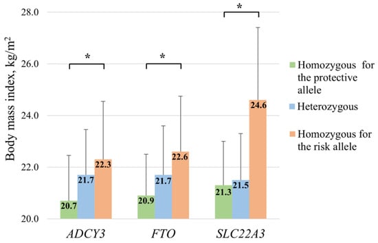 The genotype distributions for the ADCY3 rs11676272, CLOCK rs1801260, FTO rs1421085, GPR61 rs41279738, RP11-775H9.2 rs1296328, SLC22A3 rs9364554, and TFAP2B rs734597 polymorphisms were in Hardy–Weinberg equilibrium (p > 0.05). To identify genetic variants associated with obesity, a case-control study was conducted, comparing allelic frequencies between overweight or obese (cases) and non-obese (controls) participants. When allelic frequencies differed by ethnicity (Supplementary Table S1), separate analyses were performed. After correcting for multiple testing, we identified associations between three genetic variants and BMI that aligned with findings in the literature, where obesity-related risk alleles were more prevalent among overweight or obese subjects. Specifically, the frequencies of the ADCY3 rs11676272 G (60.3 vs. 41.0%, p = 0.03), FTO rs1421085 C (46.7 vs. 32.0%, p = 0.04), and SLC22A3 rs9364554 T (38.0 vs. 23.7%, p = 0.01) alleles were significantly higher in overweight or obese individuals compared to non-obese participants (Supplementary Table S2). Furthermore, BMI (SD) significantly (p < 0.05) increased with an increase in the number of risk alleles in the whole cohort (ADCY3: 20.7 (3.5) → 21.7 (3.2) → 22.3 (3.4) kg/m2; FTO: 20.9 (3.5) → 21.7 (3.8) → 22.6 (3.6) kg/m2; and SLC22A3: 21.3 (4.5) → 21.5 (4.3) → 24.6 (5.6) kg/m2) (Figure 1).
