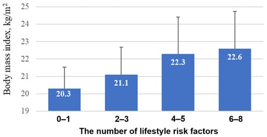 Additionally, we investigated the correlation between body mass index (BMI) and the number of risky lifestyle parameters. As shown in Figure 3, the presence of two additional lifestyle risk factors was significantly associated with an increase in BMI (20.3 (2.5) → 21.1 (3.2) → 22.3 (4.2) → 22.6 (4.3) kg/m2; p < 0.0001 for the linear trend). When the number of lifestyle factors ranged from six to eight, BMI reached its peak value of 22.6 kg/m2.