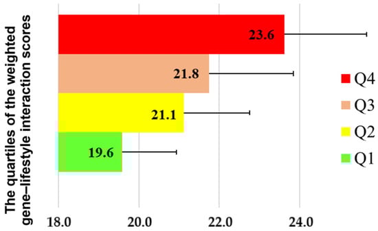 This model explained 15.0% of the variance in BMI among subjects (p < 0.0001). Additionally, the interaction between individual lifestyle factors and the genetic risk score was assessed. A significant interaction was identified between the polygenic score and several lifestyle variables, including meal frequency, frequency of overeating, nut consumption as a snack, years of physical activity, sleep duration, and bedtime (Supplementary Table S5). As shown in Figure 4, the quartile analysis of the weighted gene–lifestyle interaction score reveals a positive correlation between quartiles and BMI (p < 0.0001). Specifically, the mean (SD) BMI for individuals in the fourth quartile was 23.6 (4.1) kg/m2, which is 1.8 kg/m2 higher than that of individuals in the third quartile (21.8 (4.2) kg/m2), 2.5 kg/m2 higher than those in the second quartile (21.1 (3.3) kg/m2), and 4.0 kg/m2 higher than individuals in the first quartile (19.6 (2.7) kg/m2). This indicates that BMI increases with a higher weighted score, reflecting the combined genetic and environmental risk factors for obesity.
