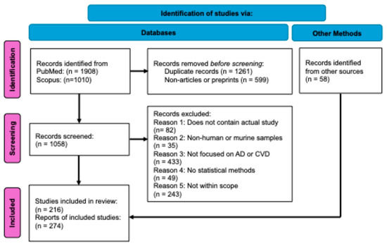After pooling search results from all three keyword searches in PubMed and Scopus, duplicate articles were removed, leaving only one copy to be screened. Only articles that contained completed research analyses were included. All non-articles or preprints were excluded. This included reviews, book chapters, commentaries, conference papers, editorials, letters, notes, protocols, and short surveys. The title and abstract of each of the remaining 1058 articles were then screened by AM (Supplemental Table S1). Articles were included in initial abstract screening if they (1) described a performed study; (2) performed the study with human and/or murine samples; (3) focused on a CVD, AD, or both; (4) used statistical methods in their approach; and (5) were within the scope of the final topics covered. These five criteria were included as columns in the Excel sheet containing the information of all screened articles. A total of 216 articles passed the screening process and were included in the scoping review (Supplemental Table S2). Relevant articles from the reference lists of the included articles that also fitted our criteria were also considered and listed in the “Other Methods” section of the procedural flow chart. A total of 58 articles were included from this section (Supplemental Table S3). In total, 274 articles were included in the final scoping review (Figure 1).