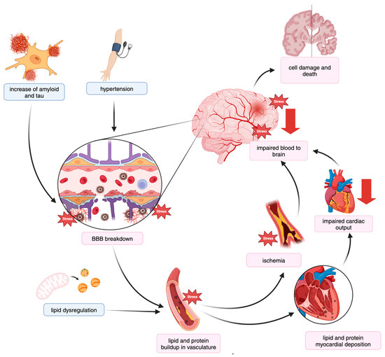 Poor cardiac function includes weaker pumping ability, meaning less blood is pumped out toward essential organs like the brain. Impaired cardiac contraction and a reduced left ventricular ejection fraction (LVEF) results in lower cardiac output, all of which have been associated with AD and dementia [194,299,300,319]. Lower cardiac output has negative effects on multiple necessary processes for maintaining brain homeostasis, as reliable blood flow and arterial pulses are required for glymphatic clearance in brain [202]. Decreased blood flow to the brain results in buildup of waste and miscellaneous proteins including Aβ and hyperphosphorylated tau (hTau) [107,116,202]. Decreased blood flow may also contribute to the initial stages of aggregating tau phosphorylation by destabilizing unphosphorylated tau [320] and inhibiting dephosphorylation [297,321]. This leads to an increase in the production to hTau, in addition to impaired clearance. Even in participants with healthy cognition, a lower LVEF was associated with the greater circulation of tau (t-tau and p-tau) [297], reinforcing the understanding that Aβ and tau aggregation and circulation begin decades before AD or CVD onset. Compromised blood flow to the brain additionally contributes to oxidative stress and inflammation, which is a large part of AD and CVD etiology [322,323].