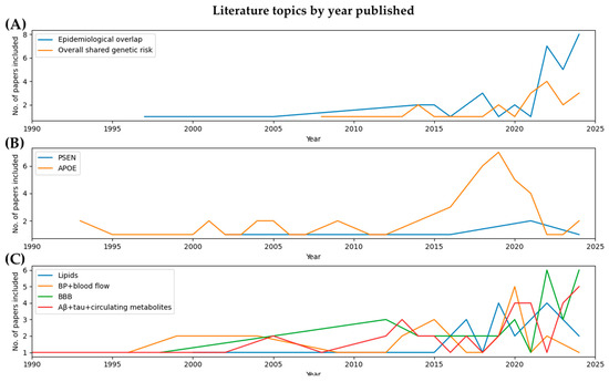 In the following sections of this scoping review, we will explore the evidence for a shared genetic risk between CVD and AD. We will delve into the specific shared genes between the two disease domains; we will also describe their different proposed mechanisms and shared biology (namely lipid metabolism, changes in blood pressure, and blood–brain barrier impairment). Using a “gene-specific” lens followed by a “shared mechanism” lens allows us to explore the different approaches that researchers have used to address this question of an underlying relationship between AD and CVD.