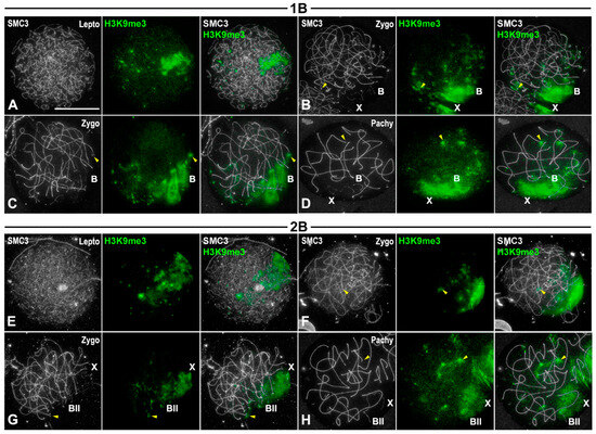 H3K9me3 labeling during prophase I stages. Double immunolabelings of SMC3 (white) and H3K9me3 (green) in prophase I spread spermatocytes from individuals with one (A–D) and two B1 chromosomes (E–H). The positions of the sex chromosome (X), the B1 univalent (B) and the B1 bivalent (BII) are indicated. (A) At leptotene, an intense H3K9me3 signal was visible in a particular nuclear region and discrete accumulations appeared in the rest of the nucleus. (B–D) From zygotene (B,C) and up to pachytene (D), the large H3K9me3 labeling was maintained and was located in the regions occupied by the X and B1 chromosomes. Additional H3K9me3 signals were positioned at some ends of the SMC3 axes of autosomal bivalents (yellow arrowheads). (E–H) In individuals carrying two B1 chromosomes, the H3K9me3 labeling was identical to that described above. The large signal corresponded to the positions of the X chromosome and the B1 bivalent. Moreover, some ends of autosome SMC3 axes presented bright foci (yellow arrowheads). Bar in (A), 10 µm.
