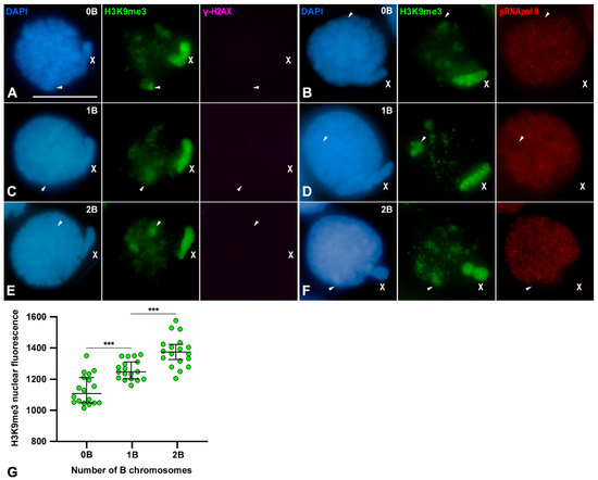 Transcriptional activity in E. plorans spermatogonial cells. Double immunolabelings of H3K9me3 (green) with either γ-H2AX (purple) or pRNApol II (red) in squashed spermatogonia counterstained with DAPI (blue) from males without (0B), with one (1B) or two (2B) B1 chromosomes. The position of the sex chromosome (X) is indicated. (A,B) Spermatogonia from 0B individuals presented H3K9me3 accumulated at the X chromosome and at certain nuclear regions (white arrowheads). γ-H2AX was not detected and pRNApol II rendered faint labeling over the nucleus, except at those regions labeled with H3K9me3 (white arrowheads). (C–F) In nuclei of 1B and 2B individuals, H3K9me3 labeled several autosomal regions (white arrowheads), and the X chromosome, but γ-H2AX was not detected. Moreover, H3K9me3 labeling corresponded with regions of reduced pRNApol II labeling. (G) Scattered dot plot of the corrected total nuclear fluorescence of H3K9me3 immunolabeling in spermatogonia from individuals presenting 0, 1 or 2 B1 chromosomes. For each class, the individual data (n = 18) and median with 95% CI are depicted. Statistical significance was assessed using an ANOVA test (p < 0.0001; ***) and Tukey’s multiple comparisons test. Bar in (A), 10 µm.