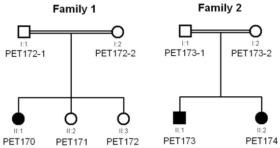 To identify the genetic variants underlying the MLD identified in the patients, we performed massively parallel targeted sequencing on the propositi of each family (PET170 and PET173) using the resequencing panel STP v3. STP v3 is based on liquid capture technology, and this panel targets all coding exons, all 5’-untranslated region exons, all exon-intron boundaries of each of the 101 genes included, plus any additional sequences, such as deep intronic sites or promoters, in which pathogenic mutations have been reported in the ClinVar database (https://www.ncbi.nlm.nih.gov/clinvar/, last accessed on 30 October 2018) [22]. The panel targeted 1821 genomic regions from 101 genes and 174 different Online Mendelian Inheritance in Man (OMIM) [23] phenotypes for a total 499 kb of sequence.
