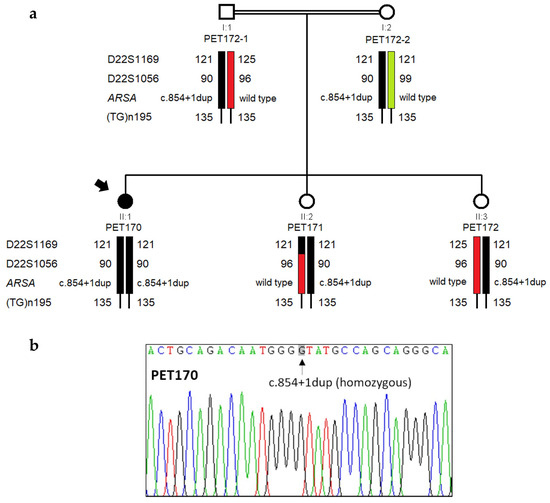 Genetic analysis of family 1. (a) Pedigree of family 1, showing chromosomal segregation with microsatellite alleles and ARSA gene variants. The distal marker (TG)n195 is uninformative in this family. (b) Electropherogram showing the homozygosity of the novel mutation c.854+1dup in the proband (PET170).