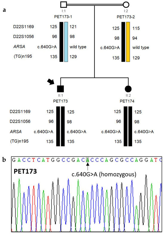 As regards family 2, panel analysis showed that affected individual PET173 was homozygous (depth: 336 reads, AF: 100%) for missense variant c.640G>A, p.(Ala214Thr) (ARSA transcript NM_000487.6). Bioinformatic analyses provided conflicting evaluations of the pathogenicity of the c.640G>A variant. Application of ACMG/AMP pathogenicity guidelines classified the c.640G>A as likely pathogenic (with criteria PM1, PM2, and PM5), notably because another pathogenic missense variant, p.(Ala214Pro) affects the same amino acid residue (Clinvar database RCV001380269.7) (Table 3). Moreover, the c.640G>A, p.(Ala214Thr) variant had already been reported in compound heterozygosity with the pathogenic variant c.893G>T, p.(Gly298Val) as underlying MLD in a Chinese subject [29]. Sanger sequencing confirmed that both affected siblings, PET173 and PET174, were homozygous for c.640G>A; microsatellite analysis confirmed the segregation of the variant and the inheritance of the pathogenic allele from both parents (Figure 3).