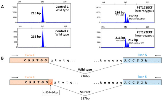 We obtained new blood samples from individuals PET171 and PET172, heterozygous for the c.854+1dup variant. We extracted total RNA from these peripheral blood samples, preserved in PAXgene™ blood RNA tubes (PreAnalytiX, Hombrechtikon, Switzerland), using the PAXgene Blood RNA kit (Qiagen & BD, Venlo, The Netherlands, and Franklin Lakes, NJ, USA, respectively), following the manufacturer’s protocol. RNA was reverse-transcribed into cDNA using Superscript II enzyme (Invitrogen, Waltham, MA, USA) and random hexamer primers. To analyze the splicing of intron 4, we designed primers enabling amplification from exon 4 to exon 5 of the ARSA gene (Table 1), with the upper primer labeled with a fluorochrome. PCR was performed on cDNAs from the mutation carriers and two unrelated wild-type controls. Labeled PCR products were treated with T4 DNA polymerase (ThermoFisher, Waltham, MA, USA) to blunt any 3′ protruding termini, allowing for correct sizing and quantification of the product using an ABI Prism 3100 Avant Genetic Analyzer (Applied Biosystems, Waltham, MA, USA). We estimated the amount of each fluorescent amplicon as the area under the curve. In parallel, we also carried out the PCR with unlabeled primers to verify the sequence of the amplicons using the Sanger method.