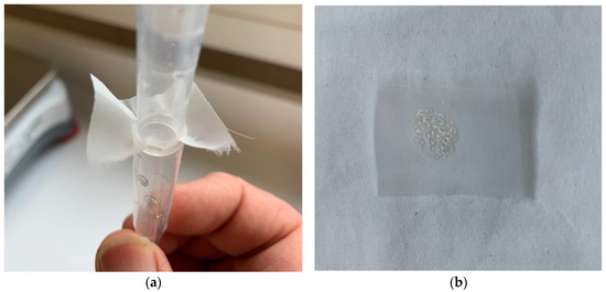 The funnel and mesh arrangement used to capture the “dry” eggs/larvae of Chrysophrys auratus, tāmure, (family Sparidae, referred to as snapper) (a). The pre-weighed patch of mesh with collected snapper eggs (b).