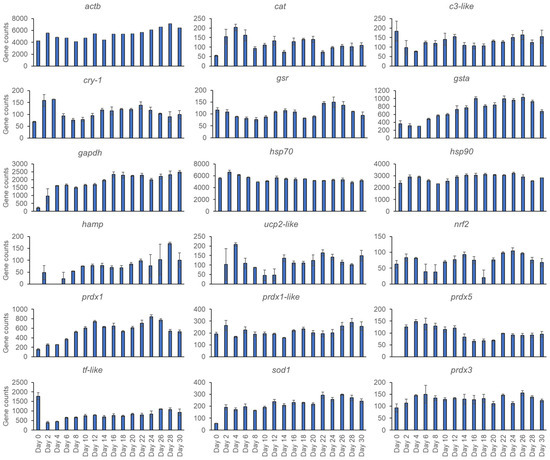 For the 18 target genes detected, most genes had stable levels of expression throughout the 30 days: gapdh and sod1 rose by about a factor of 10 between Days 0 and 2; ucp-2 like and prdx5 were not present at Day 0, but were from Day 2 onwards, and hamp varied in presence between Days 0 and 6, then stabilized after Day 6 (Figure 2).