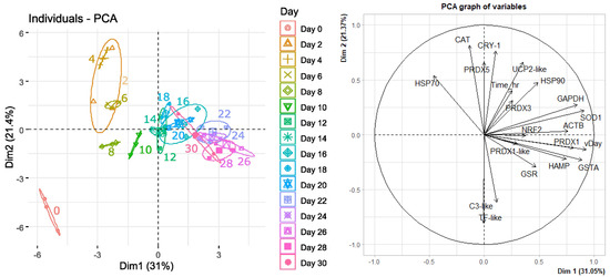 Mean counts (n = 3) for Chrysophrys auratus, tāmure, larvae genes (family Sparidae, referred to as snapper) every 2 days until 30 days are shown as individual data points and colour coded for each day on the principal components analysis (PCA) graph of individuals, whilst variables influencing the individual data points are shown on the PCA graph of variables.