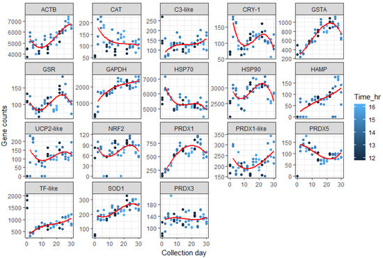 This study also highlighted the importance of collecting samples at the same time of day, since the gene expression of many genes, including antioxidant response genes, fluctuated in daily rhythms along with the circadian genes, such as cry1, used in our study. For our study, the collection time of samples did vary each day between 11:45 a.m. and 16:10 p.m. We explored whether this small variation in collection time may have affected our levels of expression by plotting earlier and later collection times against the trendline of expression over the days. Most convincing was the effect of time of collection with cat expression where earlier times had lower expression (Figure 4). Changes in expression of some genes related to stress and immune response in the early larvae phase (30 days post-hatch) were modified in offspring of broodstock fed diets with differing amounts of linseed oil with replaced fish oil [14]. For example, hsp 70 (a key gene for cytoprotection) increased approximately 1.5-fold in larvae from parents fed linseed oil, which replaced fish oil by 60, 80 and 100%. Whilst pro-inflammatory Tumour Necrosis Factor alpha (tnf-alpha) increased over 2-fold in larvae from parents fed 80% linseed oil compared with those fed 0, 60 and 100% linseed oil, which replaced fish oil in their diets.