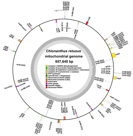 Zhai, S.; Lin, F.; Shu, X.; Niu, H.; Jing, Q.; Gao, L.; Gao, X.; Liu, D. Mitochondrial Genome Assembly and Comparative Analysis of Chionanthus Retusus (Oleaceae). Genes 2024, 15, 1523. https://doi.org/10.3390/genes15121523