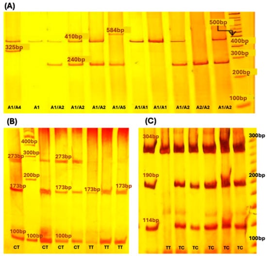 (A) Electrophoretic bands corresponding to the alleles of the rs2234663 variant identified on 6% (29:1) polyacrylamide gels stained with silver nitrate: allele 1 (410 bp, 4 repeats), allele 2 (240 bp, 2 repeats), allele 3 (500 bp, 5 repeats), allele 4 (325 bp, 3 repeats), and allele 5 (584 bp, 6 repeats). (B) Genotypes of rs1143627 digested with AluI: TT (173 and 100 bp) and heterozygous CT (100, 173, and 273 bp). (C) Genotypes of rs16944 digested with AvaI: TT (304 bp) and heterozygous TC (114, 190, and 304 bp).