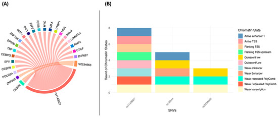 Regulatory elements (A) targeting the genomic region of the variants. The rs1143627 variant is located in a region harboring numerous IL-1β regulatory elements, including transcription factors. Similarly, rs2234663 is located in regions where CEBPA and ZNF605 play regulatory roles on IL-1RN. (B) The chromatin state in the genomic region of the variants. It is observed that the variants are located in regions with a chromatin state associated with regulatory functions, indicating that they could influence the regulation of gene expression.