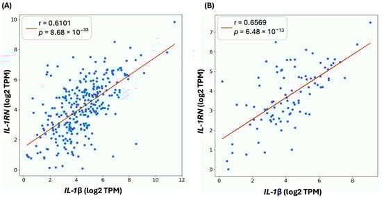 In addition, we observed a positive correlation in the co-expression of IL-1β, and IL-1RN in COAD (r = 0.6101, p = 8.68 × 10−33) (Figure 5A) and READ (r = 0.6569, p = 6.48 × 10−13) (Figure 5B).