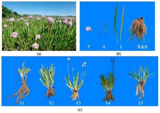 Plant materials. (a) Whole plant of cultivated N. jatamansi. (b) Four tissues of N. jatamansi (flowers [F]; anthocaulus [A]; leaves [L]; roots and rhizomes [R&R]). (c) Developmental stages of N. jatamansi (rejuvenation stage [S1], budding stage [S2], flowering stage [S3], fruiting stage [S4] and withering stage [S5]).