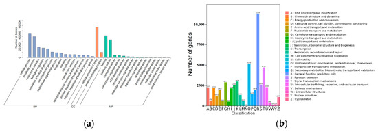 The UniGene sequences were annotated against the KEGG, NR, Swiss-Prot, GO, COG/KOG and TrEMBL databases using the DIAMOND BLASTX v2.0.9. Subsequently, the amino acid sequences of the UniGenes were predicted and annotated using the HMMER 3.2 against the Pfam database. The annotation results for different tissues are as follows: KEGG (61,527; 53.5%), NR (79,656; 69.26%), Swiss-Prot (60,548; 52.64%), TrEMBL (79,732; 69.32%), KOG (47,545; 41.34%), GO (70,147; 60.99%) and Pfam (59,543; 51.77%) (Figure S2A). Similarly, the annotation results for different developmental stages are as follows: KEGG (78,542; 50.96%), NR (102,036; 66.2%), SwissProt (75,872; 49.23%), TrEMBL (103,764; 67.33%), KOG (63,523; 41.22%), GO (90,539; 58.74%) and Pfam (77,459; 50.26%) (Figure S2B).
