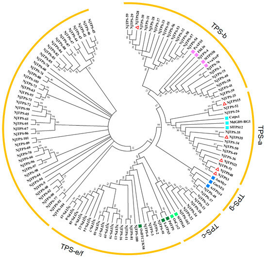 Phylogenetic tree of NjTPSs. Different colours represent different terpene synthase subfamilies: ■ TPS-a, ■ TPS-b, ■ TPS-c, ■ TPS-g and ■ TPS-e/f. △ is the gene reported by Mingkang Feng et al. [19]. Information on TPS genes used for phylogenetic analysis is shown in Table S1.