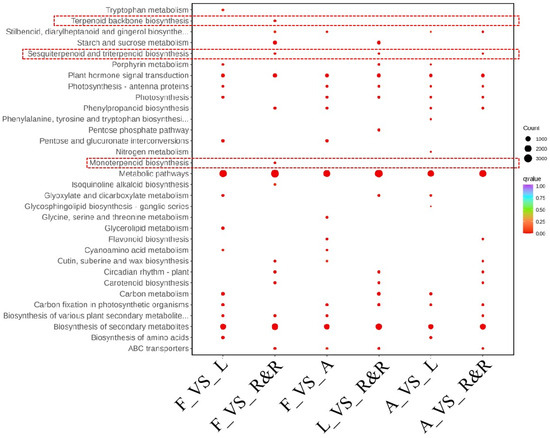 A comparison KEGG_Enrichment Bubble. The abscissa is the comparative combination; the ordinate is the enrichment pathway; the size of the point represents the number of genes enriched to the pathway; the larger the point, the more genes are enriched to the pathway; the colour of the point represents the significance value of the enrichment to the pathway; and the redder the colour of the point, the more significant the enrichment. The red dashed box represents the situation of the enriched genes in the terpene metabolic pathway for each comparative combination.