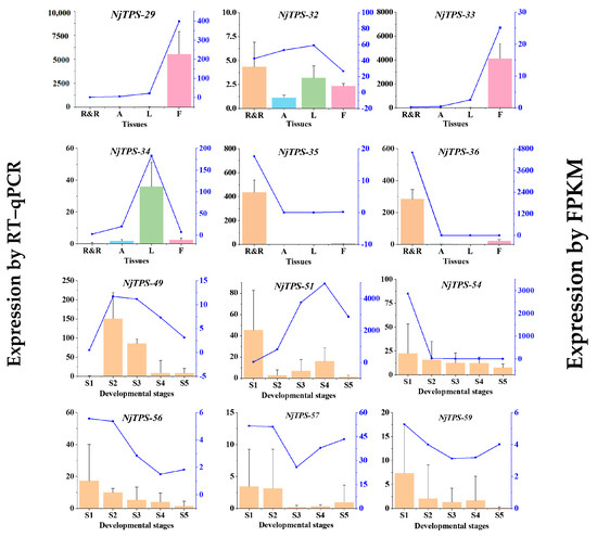 Based on the FPKM values of various UniGenes in the transcriptome data, as well as the annotation results in the KEGG pathways Ko00900 and Ko00909 and the annotation results in the Pfam database, 12 genes involved in sesquiterpene biosynthesis differential expression were screened across different tissues and developmental stages. RT–qPCR was employed to detect the expression level differences in sesquiterpene synthesis-related genes in different tissues and developmental stages to validate the accuracy of the transcriptome data. The primer sequences can be found in Table S2. The results show that the expression trends of the validated genes in various tissues and developmental stages were mostly consistent with the transcriptome data, indicating the reliability of the transcriptome data (Figure 5). Amongst them, NjTPS-32, 35 and 36 showed the highest expression levels in the roots. Meanwhile, NjTPS-34 revealed the highest expression levels in the leaves, and NjTPS-29 and 33 exhibited the highest expression levels in the flowers.
