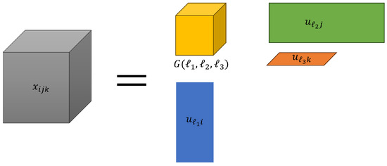 We employed the Tucker decomposition [7] using the higher-order singular value decomposition (HOSVD) algorithm. Tucker decomposition is a type of tensor decomposition. In the following, we refer to tensor decomposition as TD. An overview of the Tucker decomposition is represented in Figure 1.