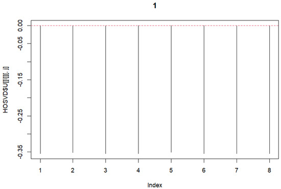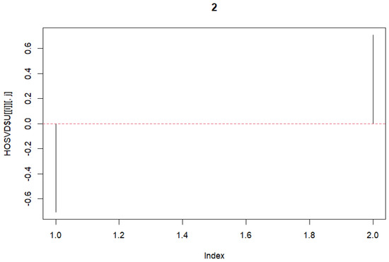HOSVD was performed on the previously mentioned 3rd-order tensor. The tensor with dimensions was formed. Dimension ‘2’ represents A101D and MeWo. Subsequently, singular vectors were selected. First, the vectors for the variable j were chosen. As these represent the same, we selected vectors with no differences. Subsequently, vectors related to k were chosen. In this case, differences were desired. Therefore, vectors with opposite signs were selected. We selected these and plotted the graphs (Figure 2 and Figure 3).