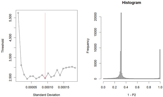 Upon choosing these vectors, the resulting graph was Figure 4. The left graph represents the dependence of the ‘flatness’ of the histogram of adjusted p-values. The histogram on the right shows -values.