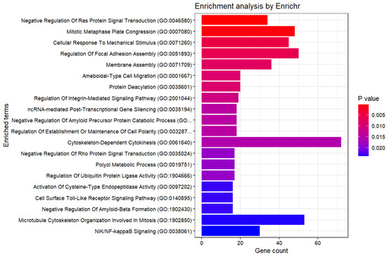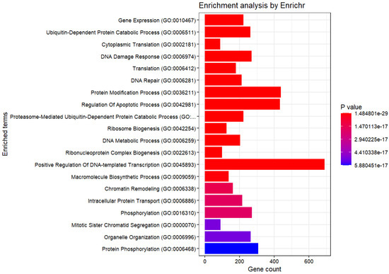 Using DESeq2 [32] to extract genes with adjusted p-values below 0.05 between the two groups, 24,204 genes were selected. Furthermore, enrichment analysis yielded the following results (Figure 7). Compared to our method, a larger number of genes were selected. The p-values in the enrichment analysis were also higher than those obtained with our method. Therefore, it can be said that our method is good.