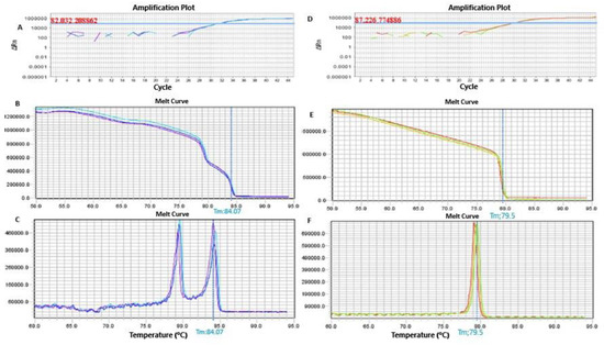 Methylation pattern of proband’s sister and proband, analyzed by MS-HRM. Amplifications plot related to normal (A), and Angelman syndrome (B). Normalized graphs (C,D) show initial fluorescence, where all products are double-stranded and bound to the maximum amount of dye. Normal patients present fluorescence drops corresponding to both paternal and maternal alleles (B). As the temperature rose, PCR products dissociated, releasing the dye and decreasing the fluorescent signal. The temperature differences between paternal and maternal alleles are attributed to the CpG binding chemistry. Methylated cytosines are nonreactive to bisulfite conversion while nonmethylated cytosines convert to uracil. CpG-rich regions require higher dissociation temperatures. The melting temperature detected for methylated maternal allele was 84.07 °C, and 79.5 °C for the nonmethylated paternal allele. Derivative graphs (E,F) illustrate the melting peak of each allele. The normal patient in derivative graphs (E) presents two peaks corresponding to the unmethylated (79.5 °C) and methylated (84.07 °C) alleles. The absence of maternal allele confirms Angelman syndrome (D,F). The different colors indicate experimental triplicates.