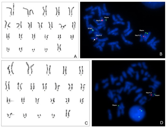 GTG banding analysis was carried out and showed an apparently normal karyotype in the proband (46,XX—Figure 3A), while his sister had an apparently balanced translocation between chromosomes 13 and 19, with apparently normal chromosome 15 by the resolution investigated, karyotype: 46,XX, t(13;19)(q22;p13.1), Figure 3B. FISH analysis with Prader–Willi Angelman probe SNRPN demonstrated the duplication of the 15q11.2 region in the proband (Figure 3A) and deletion at 15q11.2 in her sister (Figure 3B).