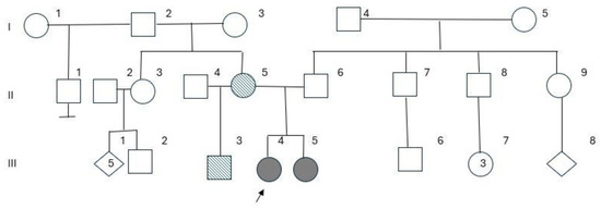 The cytogenetic study was performed according to a standard protocol: a heparinized peripheral blood sample was collected from patients and all family members. Lymphocyte cultures were performed for 72 h, stimulated with phytohemagglutinin (PHA), and maintained in RPMI 1640 medium and 20% fetal bovine serum. The culture was terminated after 1 h in the presence of colchicine (16 μg/mL) and successive fixations in methanol/acetic acid (3:1). The slides were prepared and stained with GTG banding (trypsin/giemsa). A minimum of 20 metaphases were analyzed at a resolution of 450/550 bands per haploid set; the images were captured by the automated cell imaging system CytoVision®, and the karyotypes were described according to the International System for Human Cytogenetic Nomenclature (2020).