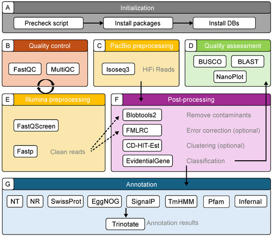 Overview of the TrAnnoScope pipeline, consisting of the following steps: (A) initialization, (B) quality control of Illumina reads, (C,E) preprocessing of Illumina and PacBio reads, respectively; (D) quality assessment; (F) post-processing, including the removal of contaminants, error correction, and cluster and classification steps, and (G) annotation. Arrows in the figure indicate the inputs for each corresponding step, showing the flow of data and dependencies between steps.