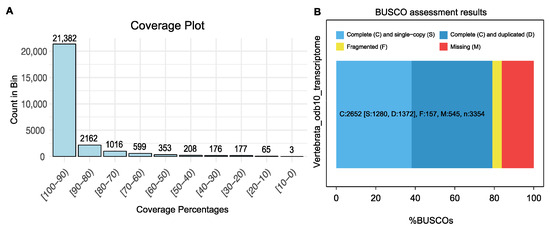 The BUSCO assessment results demonstrated the completeness of the transcriptome based on the presence of BUSCOs from the vertebrate lineage (Figure 2B). The analysis revealed that the FL transcripts matched 83.8% of the single-copy orthologs in the BUSCOs, comprising 79.1% complete orthologs and 4.7% fragmented orthologs out of a total of 3354 orthologs. Additionally, 16.2% of the orthologs were classified as missing (Table 3). While this BUSCO result indicates a reasonably high level of completeness, it also highlights potential limitations in the transcriptome assembly. The observed BUSCO completeness score can be attributed to the limited sampling of only three specific tissue types. BUSCO scores assess the presence of conserved, single-copy orthologs expected in a comprehensive transcriptome. By focusing on a smaller number of tissue types, only a subset of the actively expressed transcripts was captured, which reduced the overall BUSCO score. This result does not indicate poor data quality but reflects the targeted nature of the sampling strategy [56]. To improve the completeness of the transcriptome, future studies could incorporate additional tissue samples to capture a broader range of gene expression. Despite the limitations, the BUSCO results, combined with the descriptive statistics, underscore the ability of the pipeline to accurately obtain transcriptomes from Illumina and PacBio data, providing a reliable foundation for subsequent functional analyses.