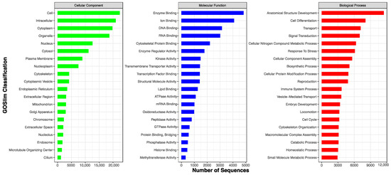 The functional annotation of the transcripts was conducted using a wide range of databases, using Trinotate with the default parameters (e-value 1 × 10−5), providing valuable insights into the roles and characteristics of the predicted proteins (Table 4). The annotation revealed broad coverage across multiple databases, enhancing our confidence in the functional assignments. Supplementary File S4 contains the annotation results for the transcripts, providing the functional annotations and sequence homologies identified through the pipeline. Out of the 39,984 transcripts, 70.7% (28,274) had significant hits against the UniProt/SwissProt database using Blastx, while 62.7% (25,051) were confirmed through Blastp searches. Domain-based searches using Pfam identified conserved protein domains in 59.2% (23,689) of the transcripts, highlighting their protein-coding potential.