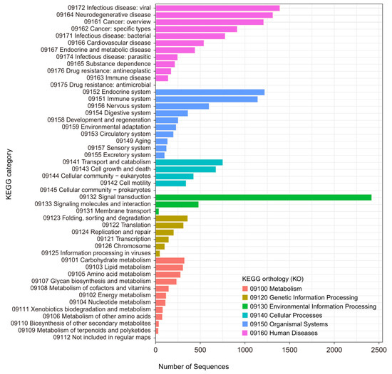 GO terms were assigned to 71.0% (28,399) of the transcripts based on homology searches against the SwissProt, Pfam, and EggNOG databases. These GO terms were further categorized into biological processes, molecular functions, and cellular components, providing an overview of the functional landscape (Figure 3). Additionally, KOG classifications were identified for 66.0% (26,409) of the transcripts through homology searches against the EggNOG database, offering insights into their evolutionary relationships and functional roles (Figure 4). The KEGG pathway analysis annotated 65.3% (26,097) of the transcripts, linking them to various metabolic and signaling pathways derived from the EggNOG annotations (Figure 5).